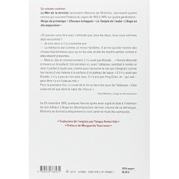 La Mer de la fertilité, testament littéraire de Mishima, réunit quatre romans qui couvrent l'histoire du Japon de 1912 à 1970, sur quatre générations : Neige de printemps ; Chevaux échappés ; Le temple de l'aube ; L'ange en décomposition. " Et pouvez-vous dire avec certitude que, tous les deux, nous nous sommes déjà rencontrés ? - Je suis venu ici il y a soixante ans. - La mémoire est comme un miroir fantôme. Il arrive qu'elle montre des choses trop lointaines pour qu'on les voie, et elle les montre parfois comme si elles étaient présentes. - Mais si, dès le commencement, il n'y avait pas Kiyoaki... " Honda tâtonnait à travers un brouillard. Cet entretien ici, avec l'abbesse, semblait à moitié un rêve. Il parlait à haute voix, comme pour recouvrer le moi qui s'éloignait comme les traces d'une haleine à la surface d'un plateau de laque. " S'il n'y avait pas Kiyoaki, il n'y a pas eu non plus Isao. Il n'y eut pas Ying Chan, et - qui sait - peut-être n'y a-t-il pas eu moi. " Pour la première fois, il y avait de la force dans les yeux de l'abbesse. " Cela aussi est tel que dans le c?ur de chacun. " (Yukio Mishima, L'Ange en décomposition, chap. 30) Le 25 novembre 1970, quelques heures après avoir signé et daté à l'intention de son éditeur L'Ange en décomposition, dernier volume de sa tétralogie, Mishima se donnait publiquement la mort, selon le rituel des samouraïs.