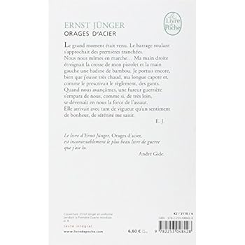 « Le grand moment était venu. Le barrage roulant s'approchait des premières tranchées. Nous nous mîmes en marche... Ma main droite étreignait la crosse de mon pistolet et la main gauche une badine de bambou. Je portais encore, bien que j'eusse très chaud, ma longue capote et, comme le prescrivait le règlement, des gants. Quand nous avançâmes, une fureur guerrière s'empara de nous, comme si, de très loin, se déversait en nous la force de l'assaut. Elle arrivait avec tant de vigueur qu'un sentiment de bonheur, de sérénité me saisit.L'immense volonté de destruction qui pesait sur ce champ de mort se concentrait dans les cerveaux, les plongeant dans une brume rouge. Sanglotant, balbutiant, nous nous lancions des phrases sans suite, et un spectateur non prévenu aurait peut-être imaginé que nous succombions sous l'excès de bonheur. »Ernst Jünger.Le livre d'Ernst Jünger, Orages d'acier, est incontestablement le plus beau livre de guerre que j'aie lu.André Gide.